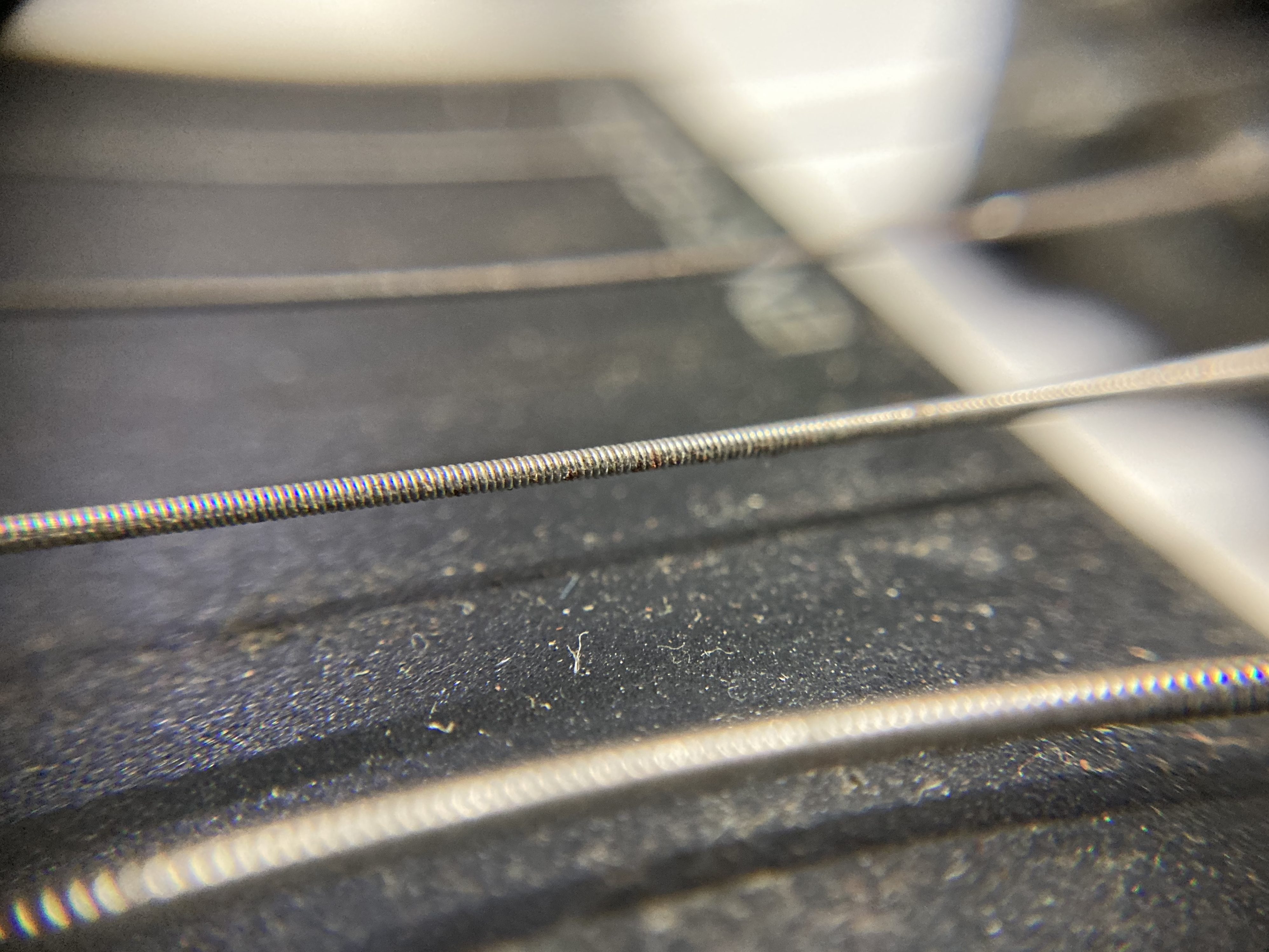 Another significant contributing factor to string death is the oils, dirt and sweat coming from our hands. Everything your hands go through build up on strings which become visually noticeable as dull and dark spots. Our sweat glands are not all created equally and I’ve seen this consistently from clients who are very sweaty (hey, they know it!) and bring their guitars to me for every string change. Some people have a slightly more acidic sweat than others and they’ll see corrosion build up quickly. All of this dirt, oil, and corrosion is accumulating on the strings and adding to the mass of the strings. It is noticeable and you’ve probably been aware of the effects.