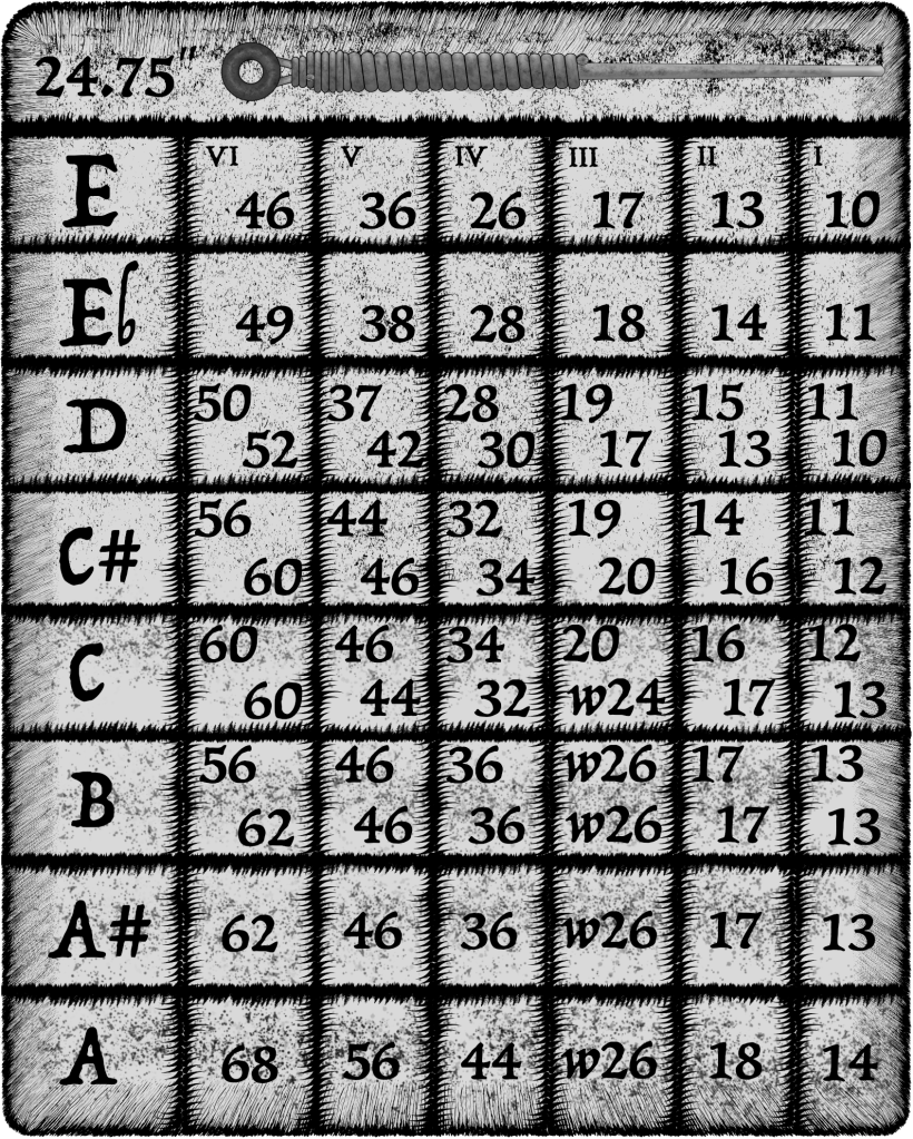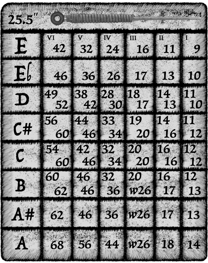 If you’re curious about tuning down your electric 6-string guitar and don’t know where to start with string gauges, allow the following charts to serve as starting points to get you in the right direction. I started with the two most common guitar scale lengths (24.75″ & 25.5″) and will provide additional charts for other scale lengths, cover 7 & 8 string guitars as well as bass and acoustic guitar string gauges.