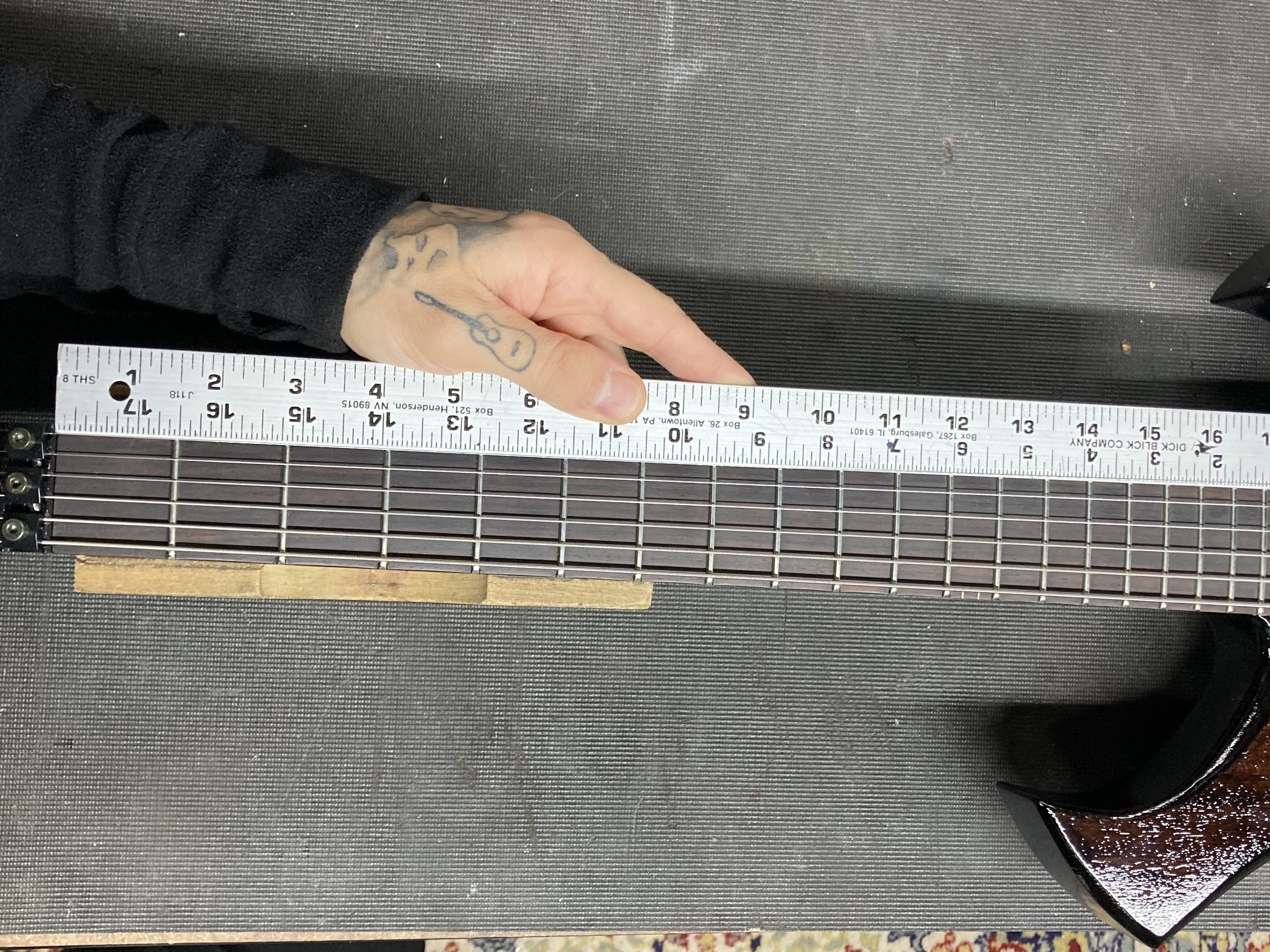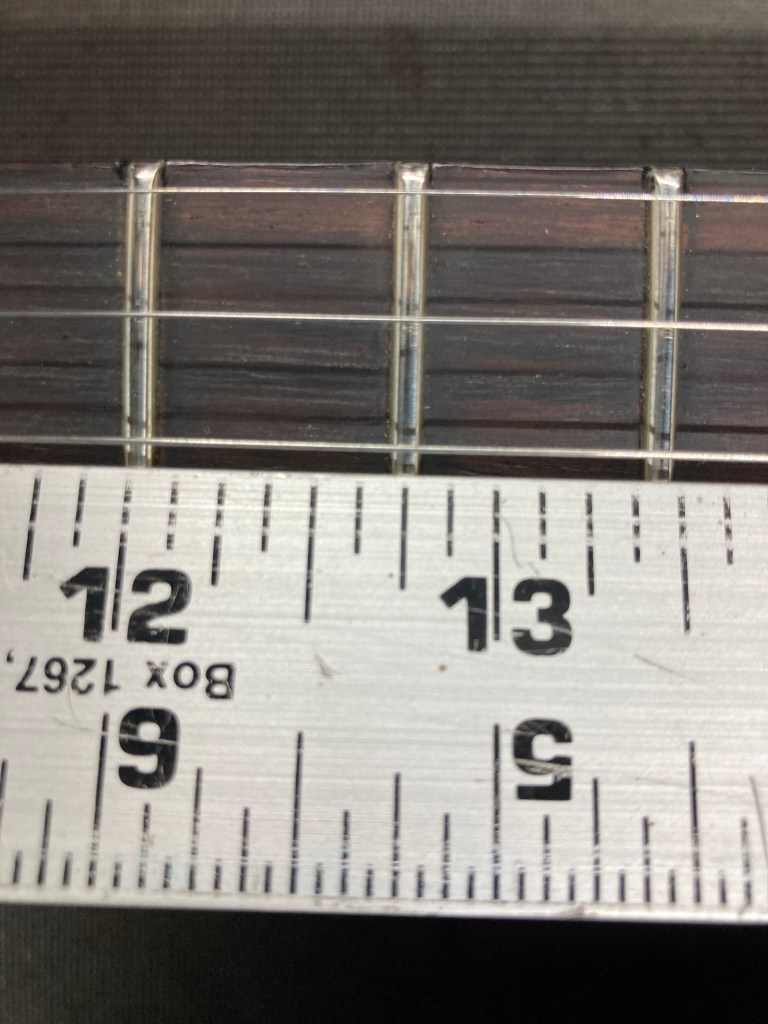Measuring from the front of the nut to any string saddle for the full measurement is flawed do to the compensation of a string’s saddle for intonation. Measuring the high E saddle could give a relatively close number, possibly 1/16″ to 1/8″ longer than the true scale length. This would pose no real problem since popular guitar scale lengths are not that close, but the PRS scale length is 25″ which is only a 1/4″ longer than the common 24 3/4″ scale of a Gibson. Measuring the length of a low E string on a Gibson scale length could lead the novice to a false measurement.