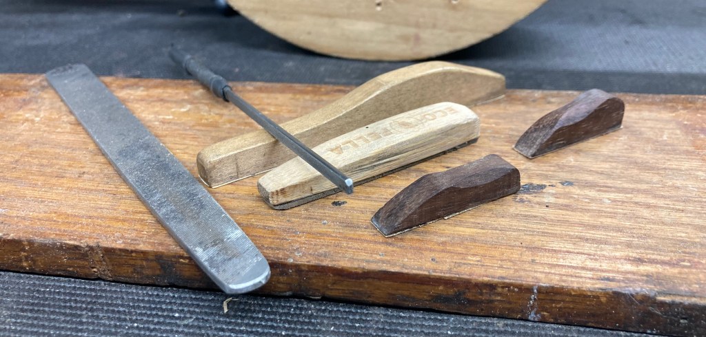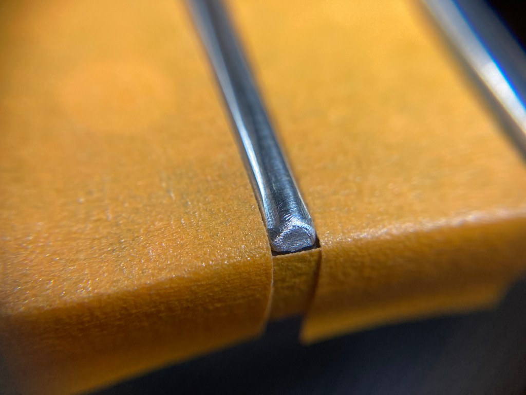 Traditionally, triangle files were and still are used by techs and luthiers for reshaping fret ends as well as crowning fret tops. I learned both of these skills with a triangle file with its edges ground dull to prevent fingerboard gouges. I purchased a file marketed as a “fret end file” about 15 years ago and I never went back to my triangle file. Its flat dull side rests against the fingerboard as I remove the burr and its rounded dull side as I round and blend one side of the fret in one fluid combination (see video below). Two swipes on each side of a fret end and I move on. This same technique is a little more difficult to execute with a triangle file. I find that fingerboard guards and other protective products have a tendency to be a cumbersome nuisance and perfecting the skill with controlled hands eliminates the consumption of unnecessary safety products.