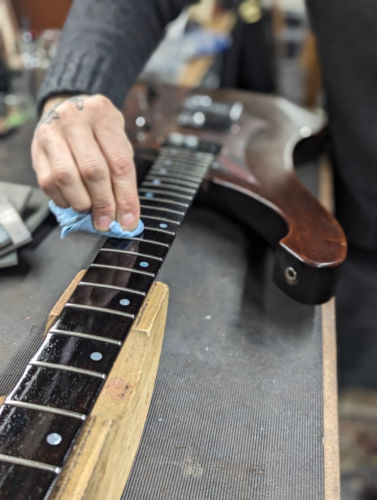 I like to remove any oils and dirt that have accumulated on the fingerboard with a shop towel and isopropyl alcohol. This is done with caution and never on a finished fingerboard (perhaps a future article will address this scenario). Once I finish polishing the frets, I’ll do a final cleaning and then rub some mineral oil across the fingerboard, allowing several minutes for it to soak in, and then wipe off the excess. Now I’m ready to restring.